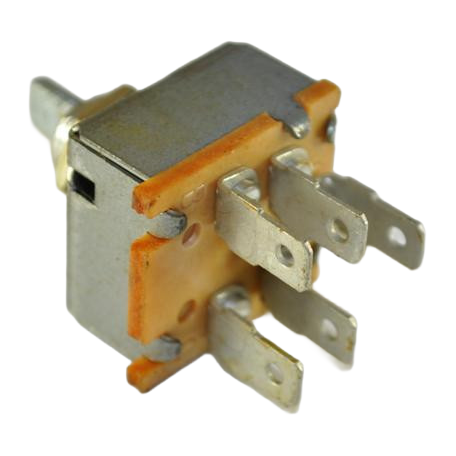 It features a DP3T design and a 25 amp (12VDC) rating for heavy-duty mobile HVAC circuits. In addition, the compact base dimensions and standard 7/16-28 UNF mounting thread help it fit common dash and panel layouts. This model is listed as a short shaft style.