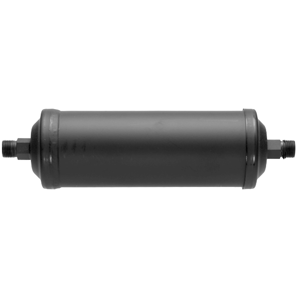 This receiver drier uses an inline configuration with #6 male O-ring connections, which supports common heavy-duty mobile A/C hose layouts. In addition, the inline design allows flexible installation within existing hose or tube runs without requiring special brackets or adapters.