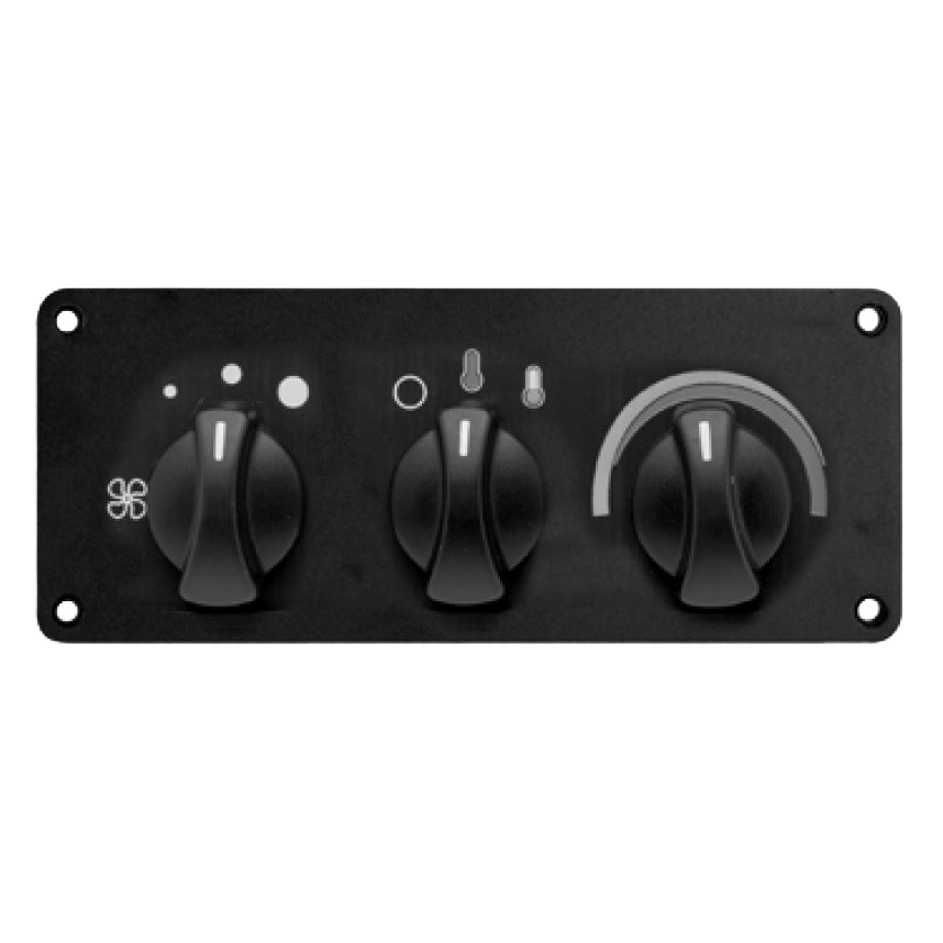 The Red Dot 71R5600 three-speed motor switch control panel is a compact control head assembly designed for reliable operation in mobile HVAC systems. It provides three fan speed selections along with manual water valve control, allowing operators to manage airflow and heat output from a single, integrated panel.